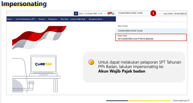 Setelah menyiapkan dokumen, pihak yang bertugas melaporkan pajak perusahaan harus melakukan impersonating akun wajib pajak badan terlebih dahulu. Selengkapnya, berikut adalah tahap-tahap untuk lapor SPT tahunan wajib pajak badan: