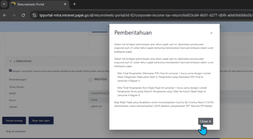 - Jika semua data sudah valid, di bagian akhir setelah klik Bayar dan Lapor akan muncul kotak dialog seperti di bawah ini.