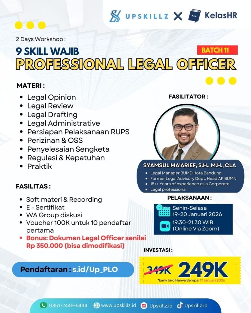 Menjadi seorang Legal Officer bukan hanya tentang memahami hukum, tetapi juga tentang menjadi penjaga kepatuhan dan integritas perusahaan. Legal Officer memainkan peran penting dalam memastikan bahwa semua kegiatan perusahaan berjalan sesuai dengan peraturan dan hukum yang berlaku. Dengan keterampilan yang tepat, Anda tidak hanya akan menjadi penjaga hukum, tetapi juga penasihat strategis yang membantu perusahaan mencapai tujuannya dengan cara yang sah dan etis.