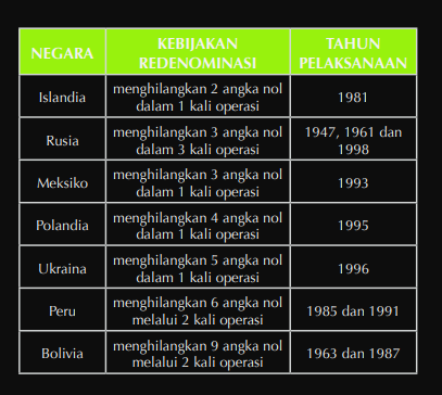 Redenominasi bukanlah hal yang baru. Beberapa negara tercatat juga pernah melakukannya, berikut adalah beberapa negara yang melakukan redenominasi: